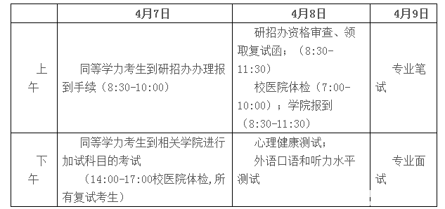 所有參加復(fù)試考生均需筆試科目一門(mén)(詳見(jiàn)招生目錄),同時(shí)參加外語(yǔ)聽(tīng)力口語(yǔ)測(cè)試及專(zhuān)業(yè)面試。同等學(xué)力考生(大專(zhuān)畢業(yè)生、本科結(jié)業(yè)生)需加試本科段兩門(mén)主干課。同等學(xué)力考生須4月7日 辦理報(bào)到手續(xù),并到相關(guān)學(xué)院進(jìn)行加試科目的考核。不按時(shí)報(bào)到參加加試的,取消復(fù)試資格。法律(非法學(xué))專(zhuān)業(yè)同等學(xué)力考生無(wú)須加試。