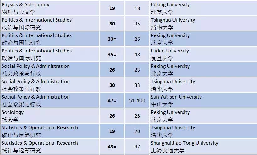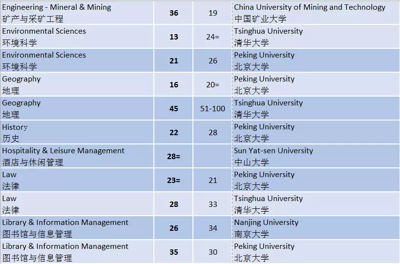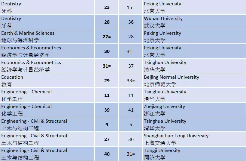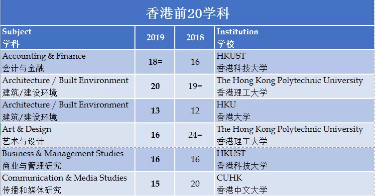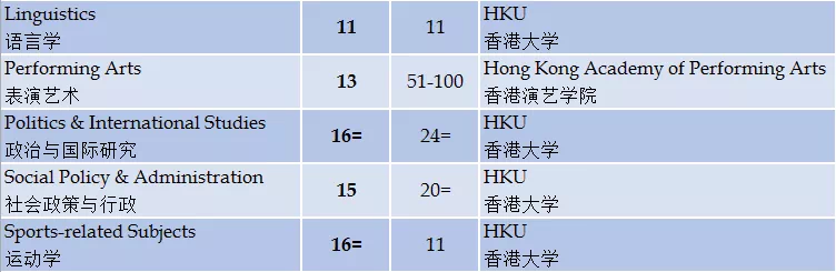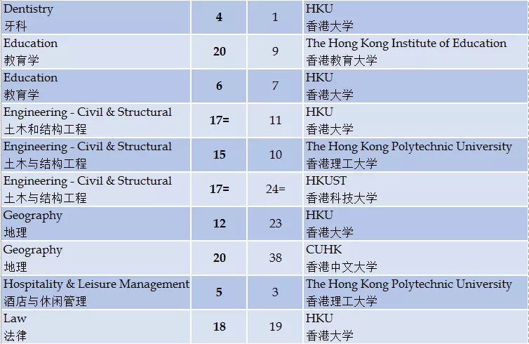 香港地區高校也表現不凡,香港大學的牙科排名世界第4,其教育研究學排名從世界第7位上升至第6位,而香港理工大學的酒店及休閑管理學科排名世界第五。