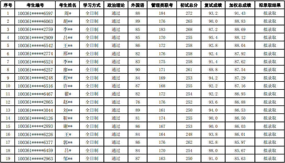 全日制擬錄取人數為52人,其中錄取最高分為272分,錄取最低分為245分,錄取平均分為252.92分。