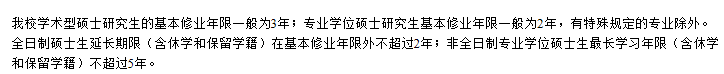 學制:專業學位碩士研究生基本修業年限為2年,非全日制專業學位碩士碩士生最長學習年限(含休學和保留學籍)不超過5年。