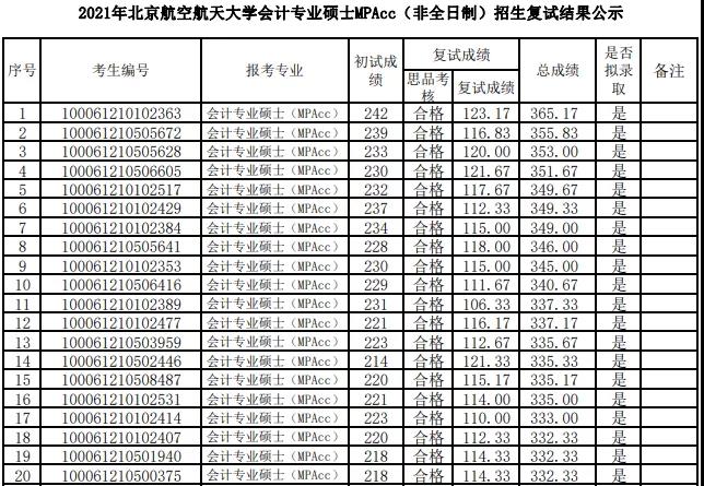北京航空航天大學2021年會計專碩復試分數線為190/90/45