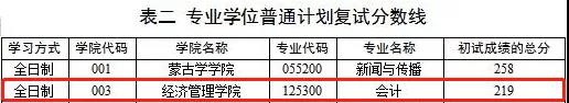 內蒙古大學2021年會計專碩復試分數線為:
