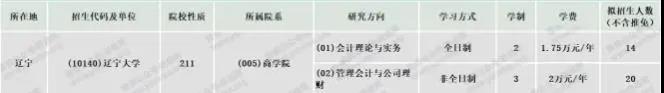 遼寧大學2020年全日制會計專碩學制學費:學制為2年,學費為1.75萬元/年;非全日制會計專碩學制學費:學制為3年,學費為2萬元/年