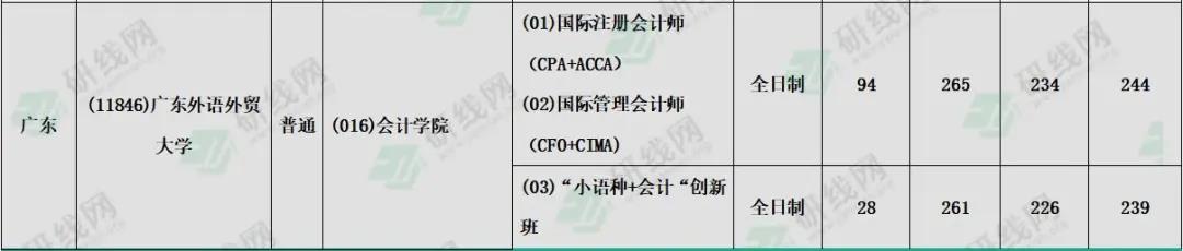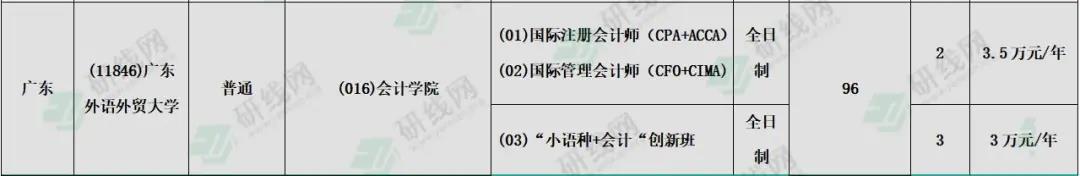 廣東外語外貿大學2021年全日制會計專碩研究方向(01)國際注冊會計師(CPA+ACCA)、(02)國際管理會計師(CFO+CIMA)擬錄取人數為94人;研究方向(03)“小語種+會計”創新班擬錄取人數為28人