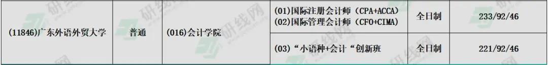 廣東外語外貿大學2021年全日制會計專碩復試分數線:研究方向(01)國際注冊會計師(CPA+ACCA)、(02)國際管理會計師(CFO+CIMA)分數線為233/92/46;研究方向(03)“小語種+會計”創新班分數線為221/92/46