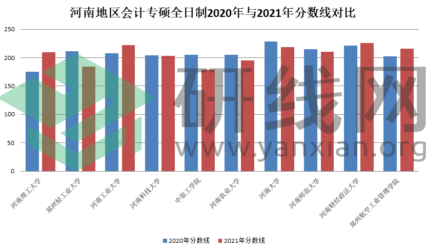 | 河南地區會計專碩全日制2020年與2021年分數線對比 | ||