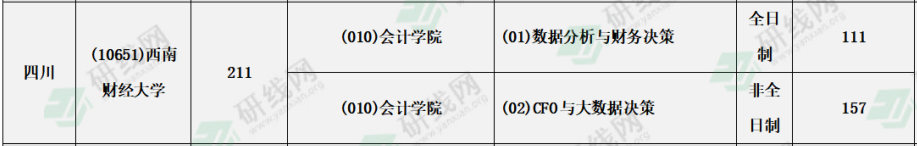 西南財經大學2021年全日制會計專碩計劃招生111人;非全日制會計專碩計劃招生157人。