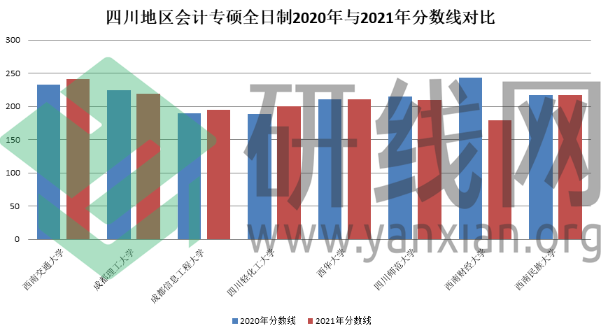 | 四川地區會計專碩全日制2020年與2021年分數線對比 | ||