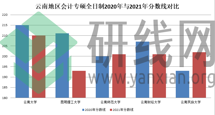 | 云南地區會計專碩全日制2020年與2021年分數線對比 | ||