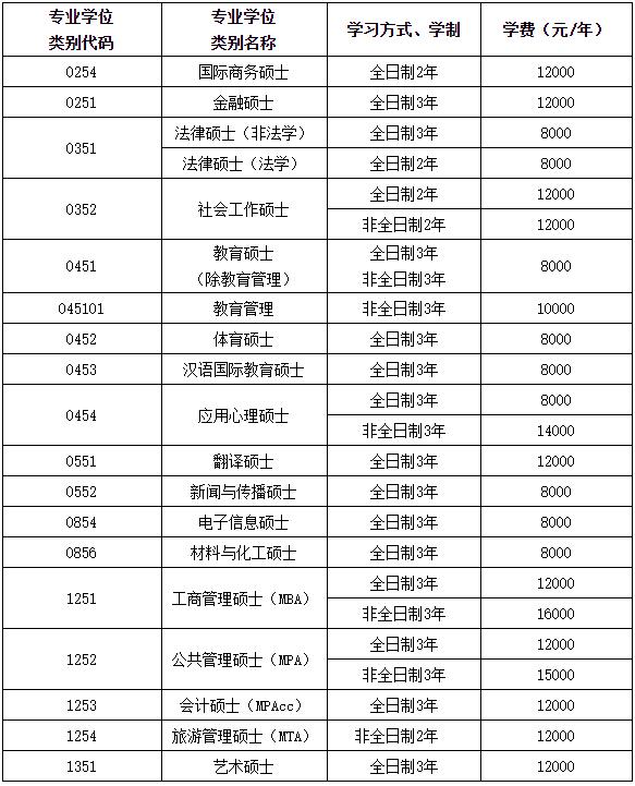 1. 學術型博士研究生每年學費10000元,專業博士學費待審批。學術型碩士學習方式全部為全日制,學制3年,每學年學費8000元;各專業學位碩士學習方式、學制及學費見下表: