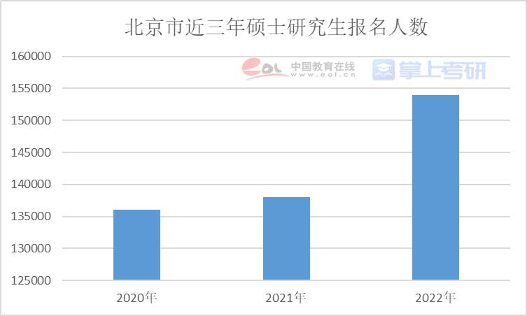 2022年北京市碩士研究生報名人數為15.4萬人,較2021年增加了1.6萬人,增幅為11.6%,這也是各省市中增幅最少的省市之一。
