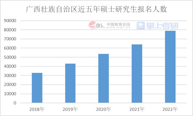 2022年廣西壯族自治區碩士研究生報名人數為7.9萬人,較2021年增加了1.5萬人,增幅為23.4%。
