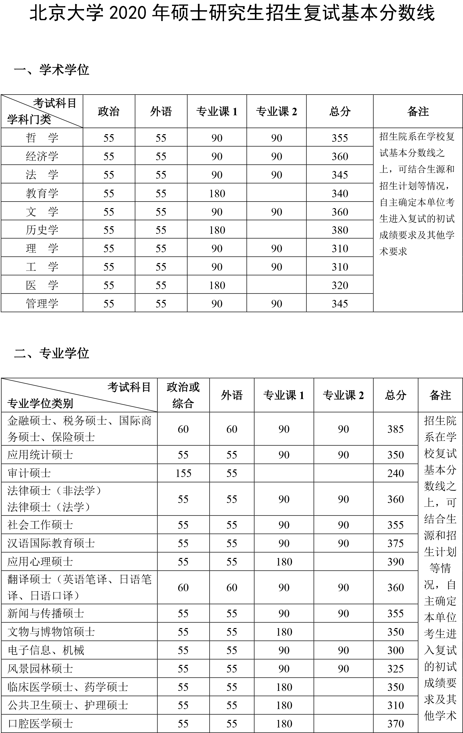繼2020考研國家線公布后,34所自主劃線院校也陸續公布分數線,北京大學公布了2020年碩士研究生招生復試基本分數線,如下所示: