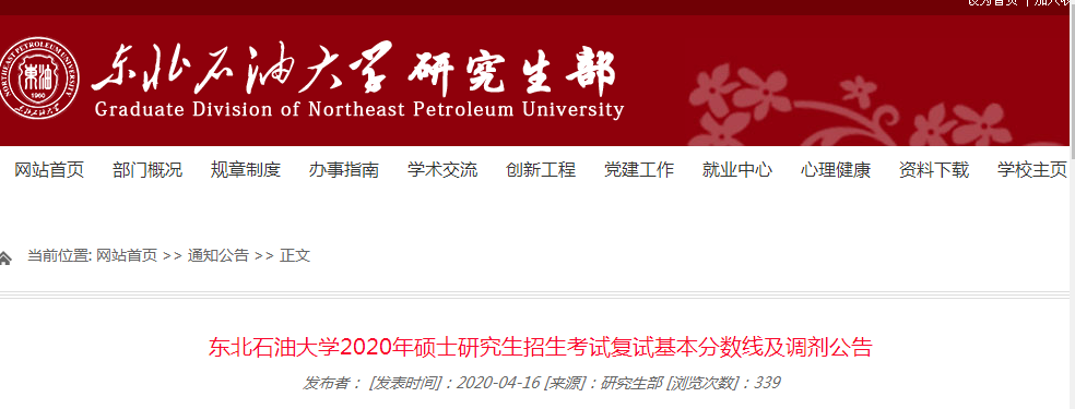 2020考研分數線:東北石油大學2020年碩士研究生招生考試復試基本分數線及調劑公告