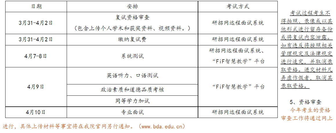 我院復試時間擬定于2022年4月9、10日進行。各項考試的詳細時間和具體要求將在我院官網及時公布。(www.bda.edu.cn)