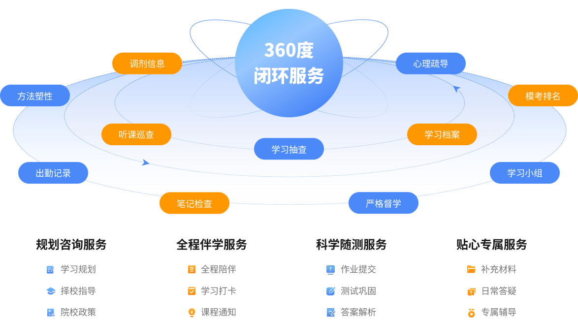 全程規劃,全程陪伴,全課程服務, 專享服務 私人服務,全資料體系,查缺補漏,健康專屬 職業發展, 就業準備,保障體系,學習空間 |