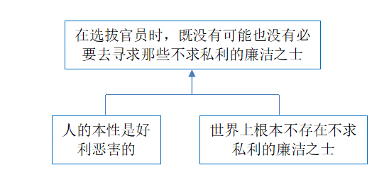 那么我們一起來思考一下,世界上真的不存在不求私利的廉潔之士嗎?答案是否定的,“人的本性是好利惡害的”并不代表“這個世界上根本不存在廉潔之士”,所以也不能由這兩個論據推理得出“在選拔官員時,既沒有可能也沒有必要去尋求那些不求私利的廉潔之士”。