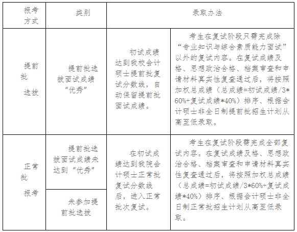 4、“提前批選拔”招生計劃約占會計碩士非全日制招生計劃的90%,“正常批報考”招生計劃約占會計碩士非全日制招生計劃的10%。“提前批選拔”與“正常批報考”類別未用完的招生計劃可打通使用。
